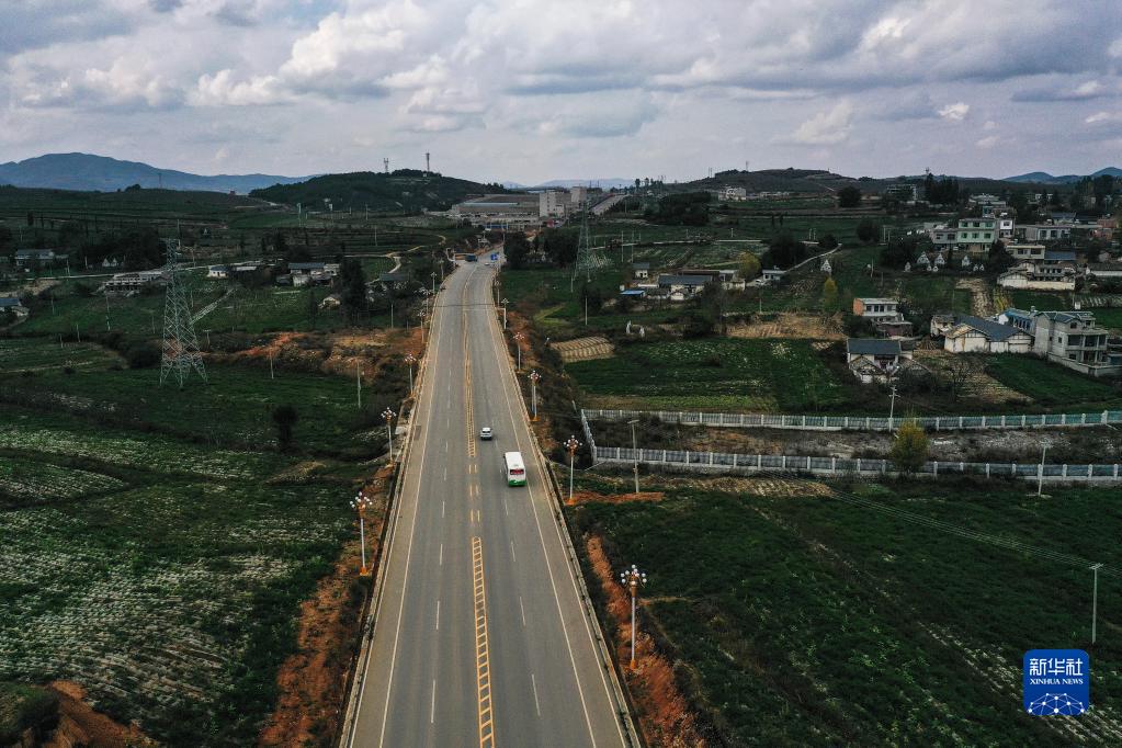 11月3日,鄉鎮公交車行駛在威寧縣迤那鎮開往牛棚鎮的公路上(無人機照片)。