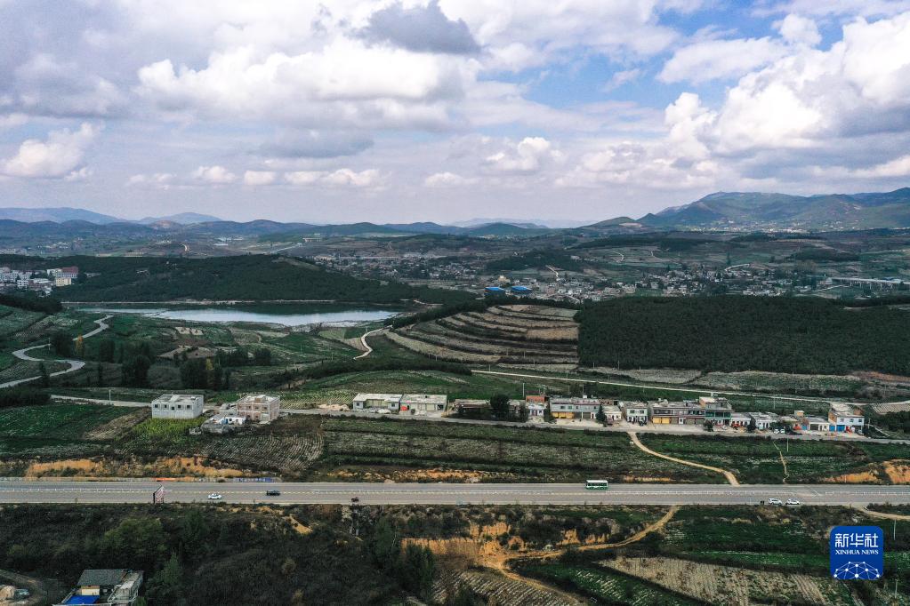 11月3日,鄉鎮公交車行駛在威寧縣迤那鎮開往牛棚鎮的公路上(無人機照片)。