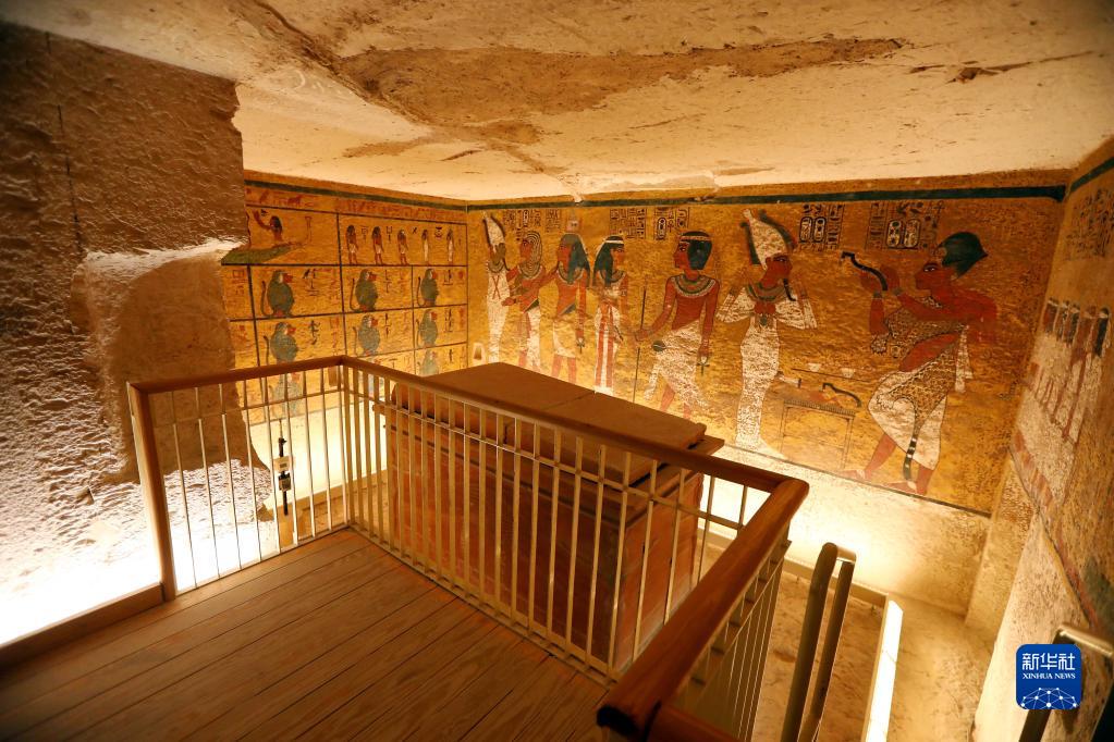 這是11月4日在位于埃及盧克索帝王谷的圖坦卡蒙墓內拍攝的壁畫和圖坦卡蒙的石棺。