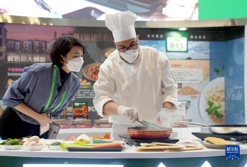 11月5日,工作人員在第五屆進博會食品及農產品展區現場烹制意大利面。