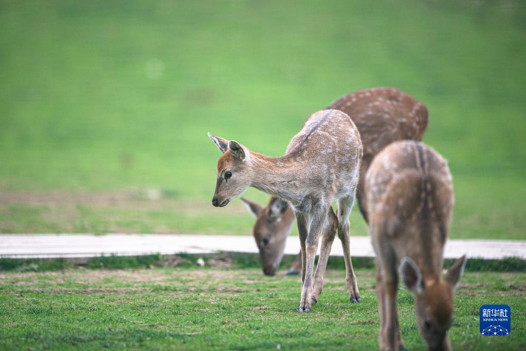 10月15日,梅花鹿在神農架大九湖國家濕地公園內活動。