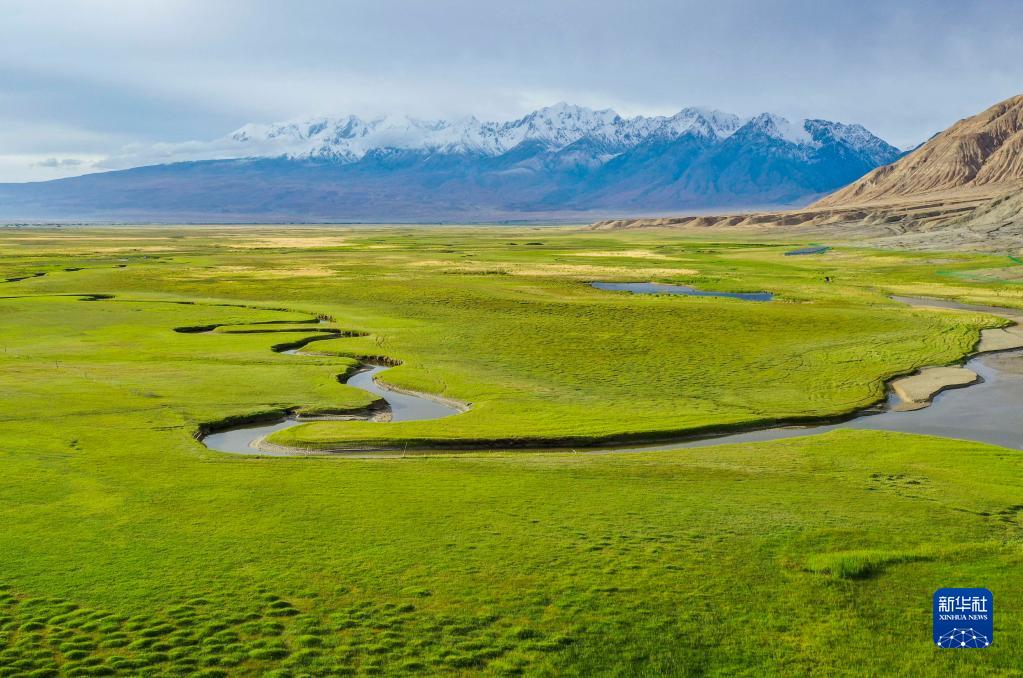 新疆塔什庫爾干塔吉克自治縣塔合曼濕地夏季景觀(2019年6月30日攝,無人機照片)。