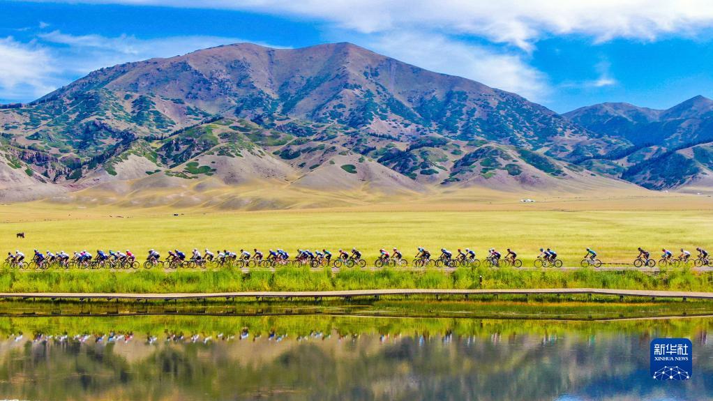 自行車賽選手在新疆賽里木湖國家濕地公園騎行(2022年7月26日攝,無人機照片)。