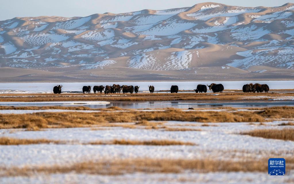 野牦牛在新疆阿爾金山國家級自然保護區內的依協克帕提濕地覓食(2019年4月2日攝)。