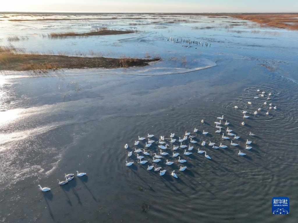 11月4日在吉林省白城市鎮賚縣莫莫格國家級自然保護區拍攝的候鳥(無人機照片)。