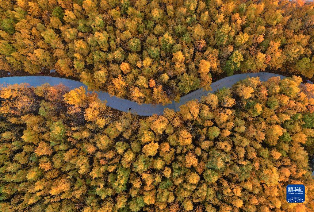 11月4日,市民在山東省威海市羊亭河濕地公園觀賞秋葉(無人機照片)。 新華社發(朱春曉 攝)