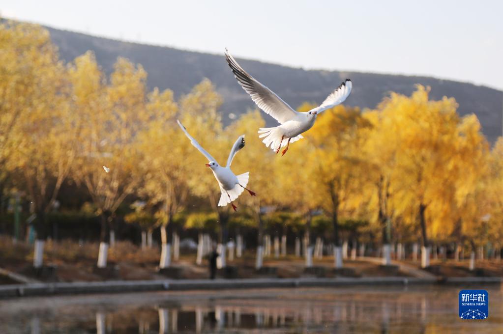 11月4日,在甘肅省定西市安定區一處公園,鳥兒在飛舞覓食。 新華社發(王克賢 攝)