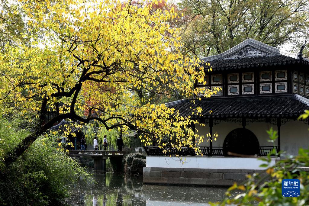 11月4日,游客在江蘇省蘇州市拙政園內賞秋。 新華社發(杭興微 攝)