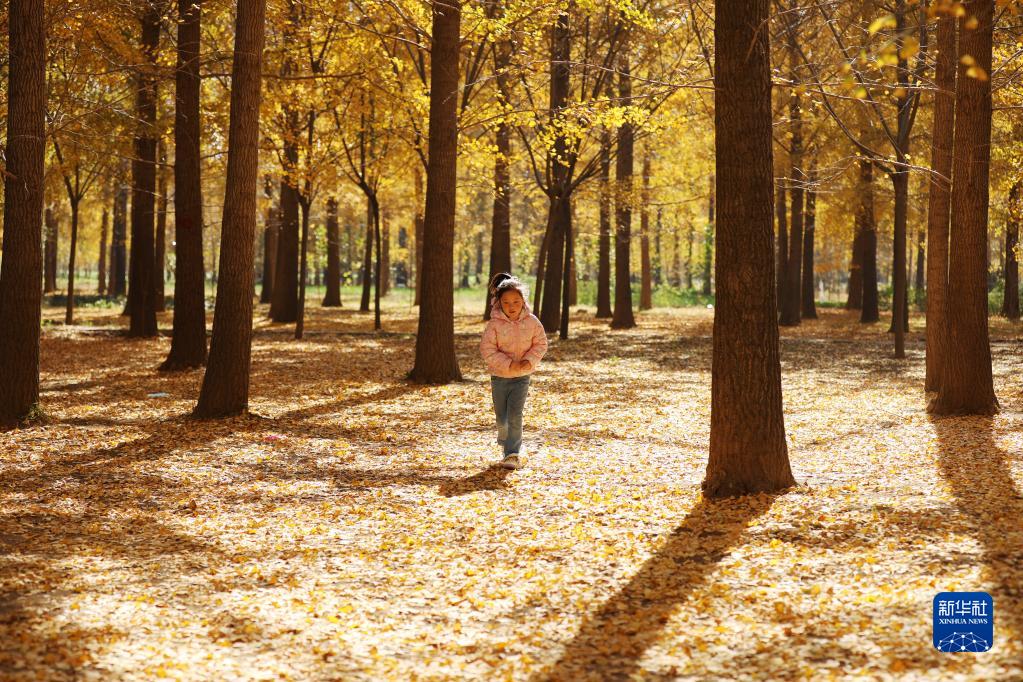 11月4日,小女孩在山東省臨沂市郯城縣勝利鎮賈灣村銀杏林中玩耍。 新華社發(張春雷 攝)
