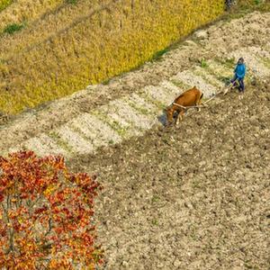 11月5日,湖北省宜昌市秭歸縣九畹溪鎮石柱村的農民在田間犁地,為冬播冬種做準備(無人機照片)。