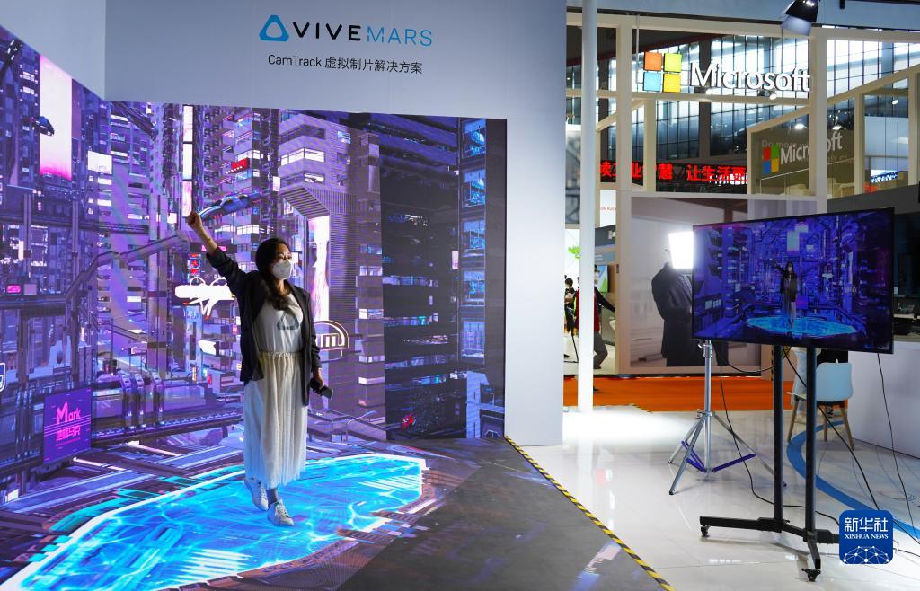 11月5日,參觀者在第五屆進博會技術裝備展區人工智能專區體驗虛擬制片解決方案。