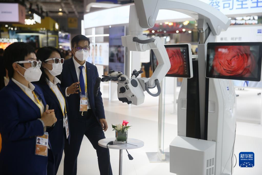 11月5日,參觀者在第五屆進博會技術裝備展區蔡司展臺體驗顯微鏡。