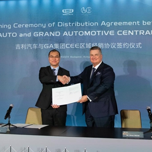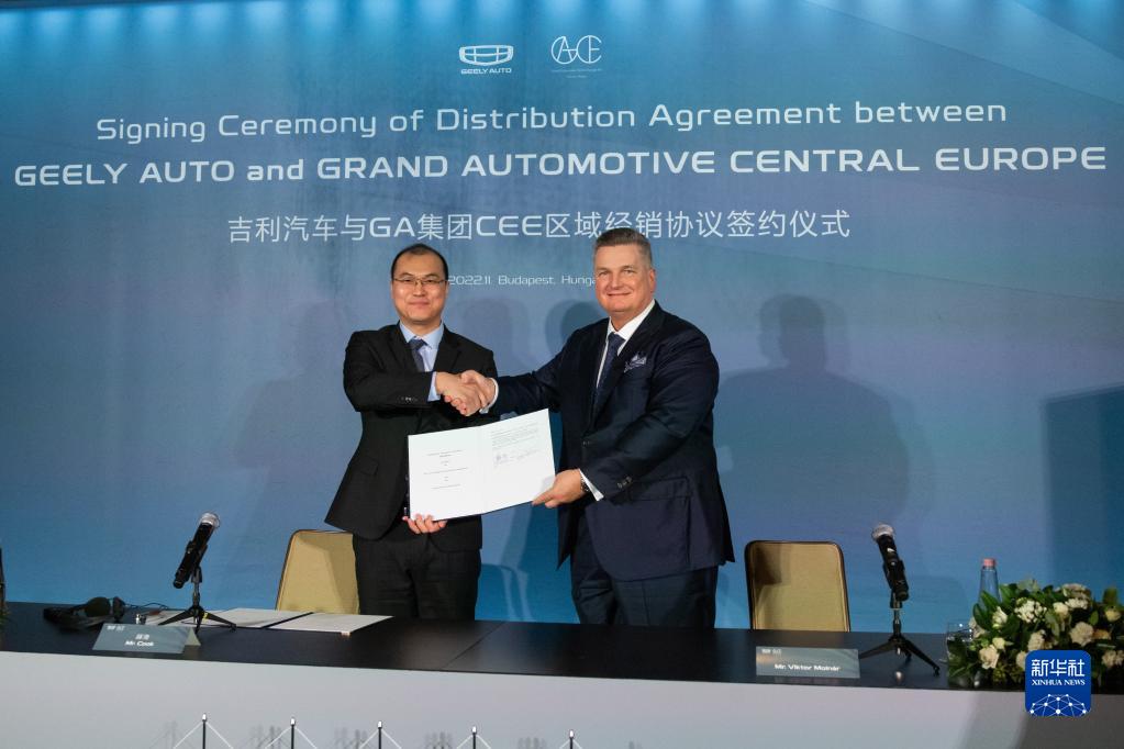 中國吉利汽車集團與匈牙利格蘭德汽車中歐公司4日在布達佩斯舉行戰略合作簽約儀式,標志著吉利汽車將首次進入歐盟市場。新華社發(弗爾季·奧蒂洛攝)