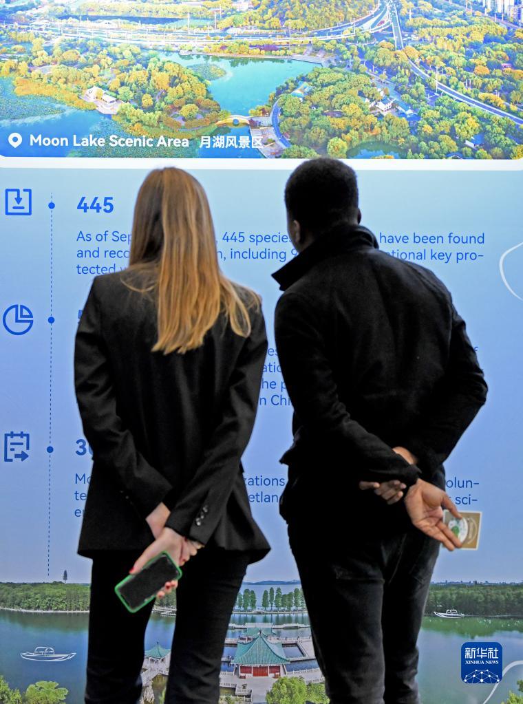 11月5日,在瑞士日內瓦,與會嘉賓在《濕地公約》第十四屆締約方大會日內瓦會場中國展區參觀。
