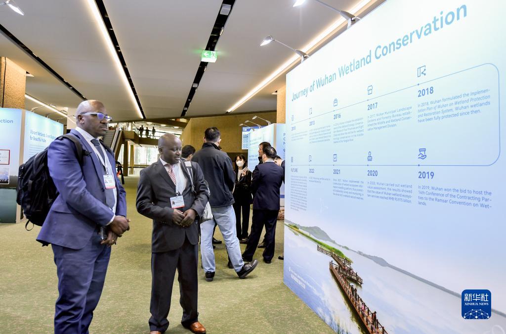 11月5日,在瑞士日內瓦,與會嘉賓在《濕地公約》第十四屆締約方大會日內瓦會場中國展區參觀。