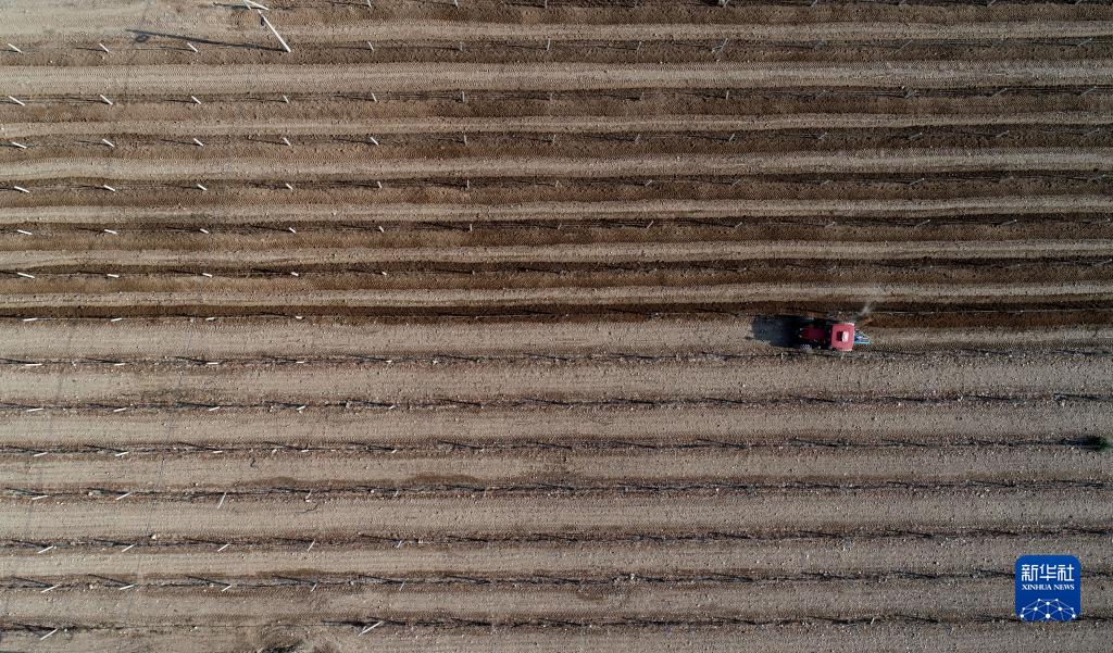 在位于寧夏銀川市賀蘭山東麓的藍賽酒莊,農民進行埋藤作業(11月5日攝,無人機照片)。