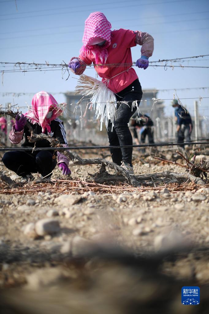 11月5日,在位于寧夏銀川市賀蘭山東麓的藍賽酒莊,農民進行埋藤作業。