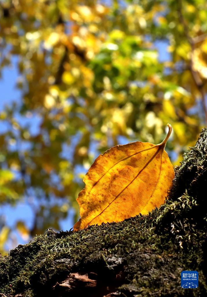 10月31日,在江蘇蘇州怡園內,一片黃葉飄落在樹干上。