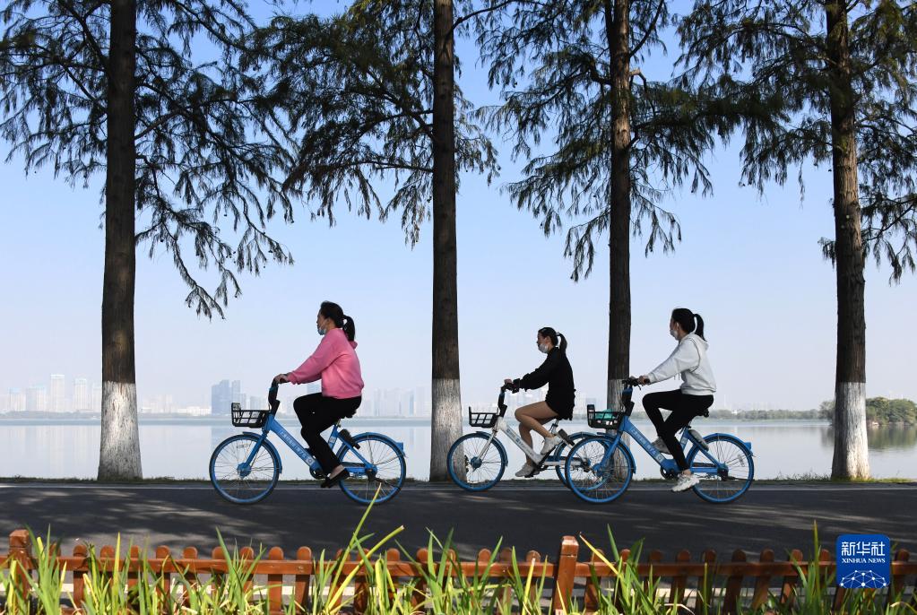 市民在武漢東湖綠道騎行(11月3日攝)。 新華社記者 程敏 攝