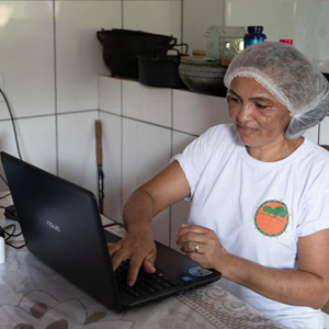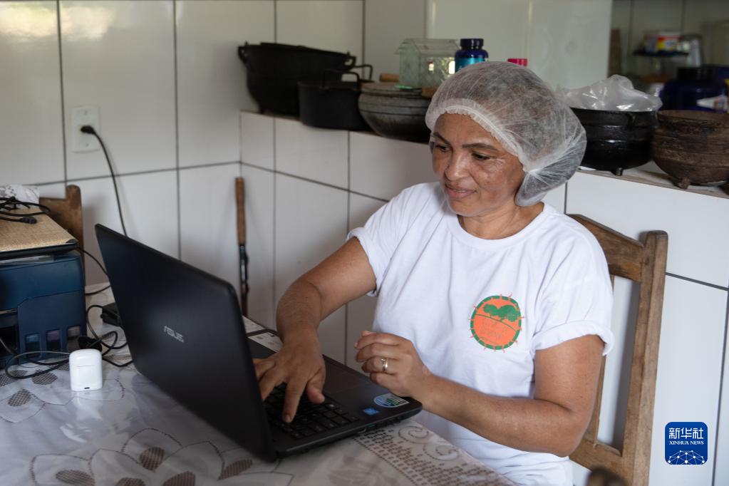 10月4日,在巴西托坎廷斯州馬利亞迪尼亞,水果加工廠工人馬萊娜在家中使用新買的電腦。