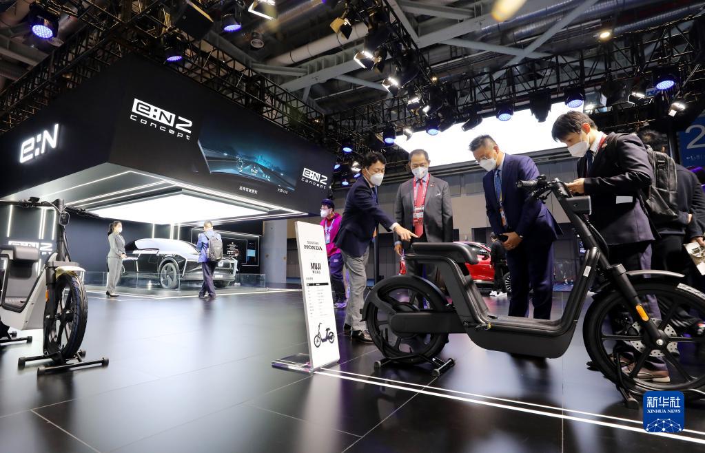 11月6日,參觀者在第五屆進博會汽車展區日本本田汽車公司旗下新能源品牌展臺觀看電動自行車展品。