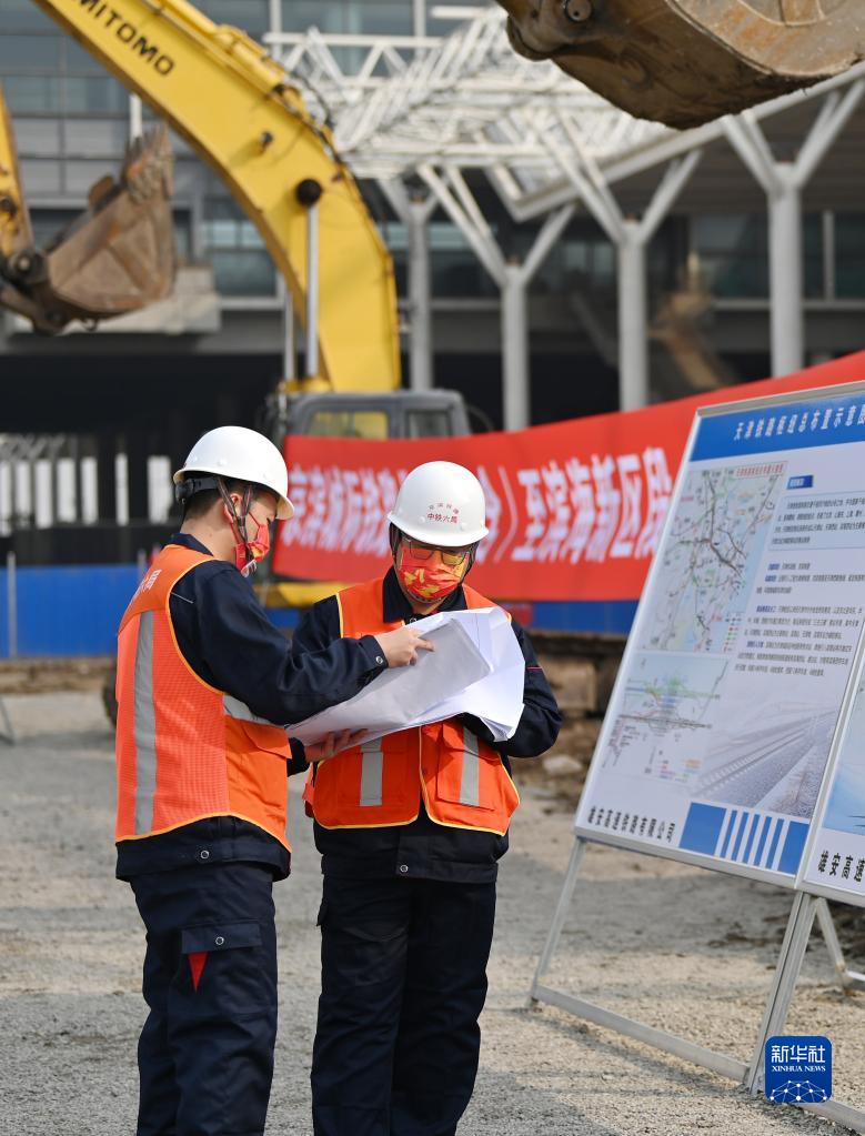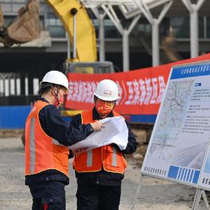 11月6日,工作人員在天津市濱海新區濱海西站施工現場核對圖紙。