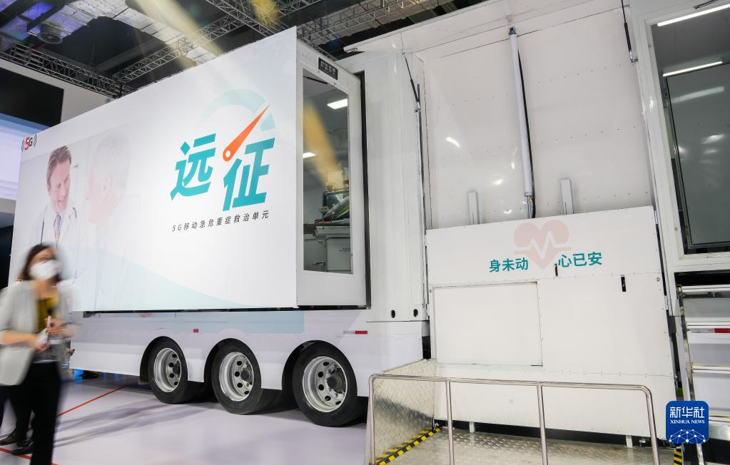 11月6日在第五屆進博會醫療器械及醫藥保健展區西門子展臺拍攝的“遠征”5G移動急危重癥救治單元。