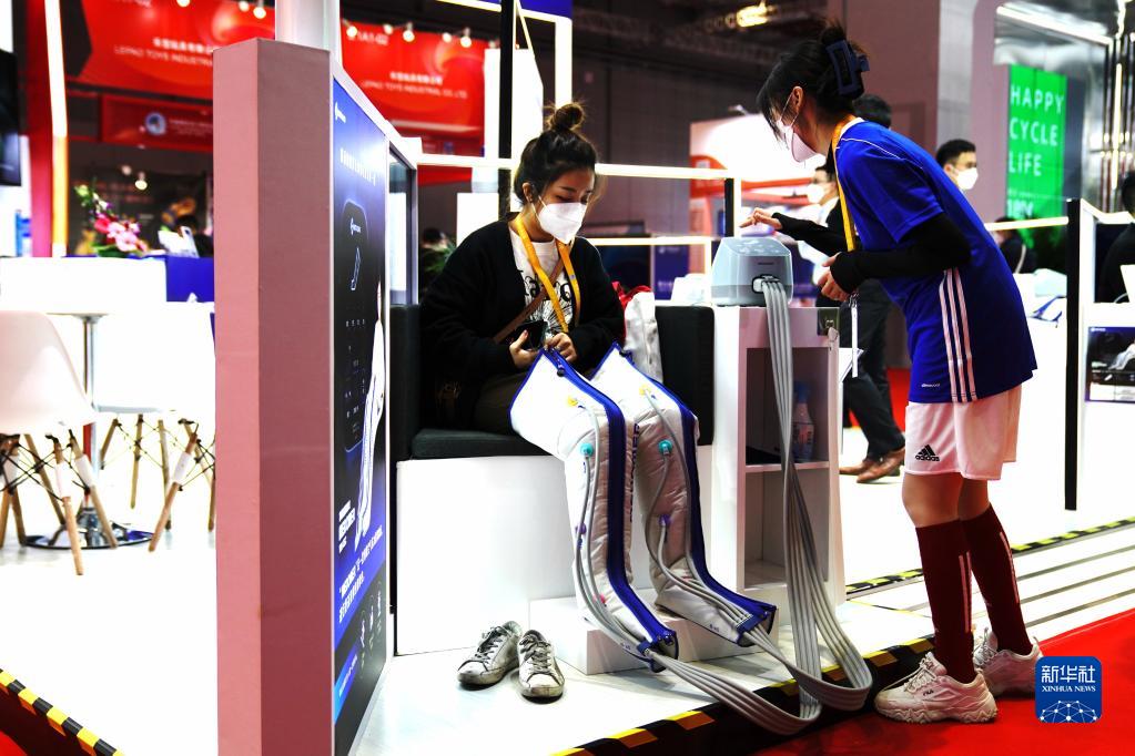 11月6日,參觀者在第五屆進博會消費品展區體驗家用腿部按摩儀。