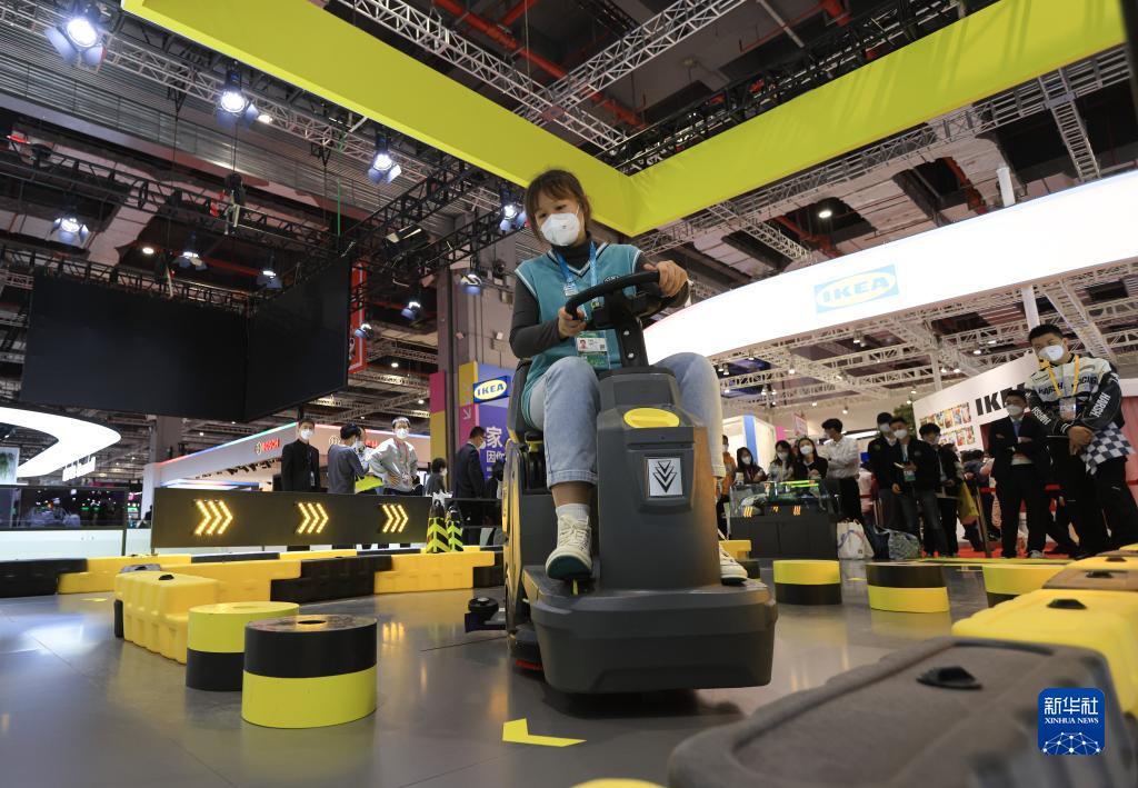 11月6日,參觀者在第五屆進博會消費品展區體驗“洗地機”。