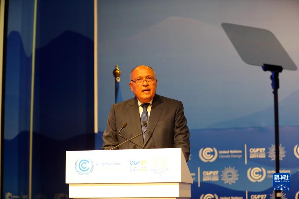 11月6日,在埃及沙姆沙伊赫舉行的《聯合國氣候變化框架公約》第二十七次締約方大會(COP27)開幕現場,埃及外長兼COP27主席舒凱里進行開幕式致辭。