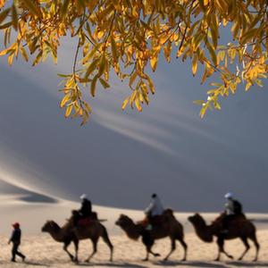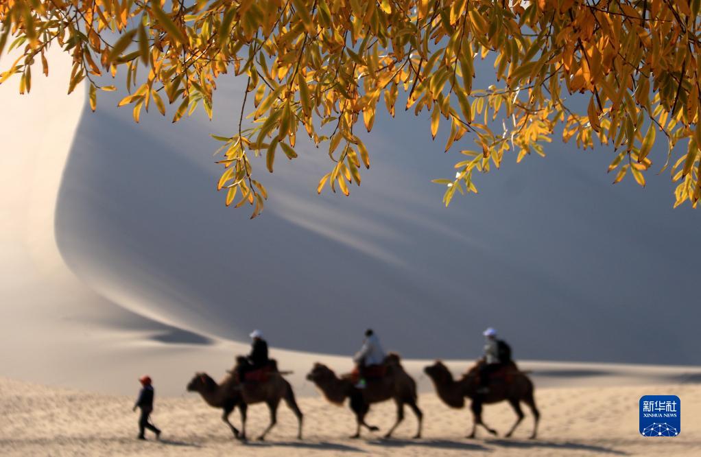 深秋時節,甘肅省敦煌市鳴沙山月牙泉景區被秋色渲染,風景如畫,引人入勝。
