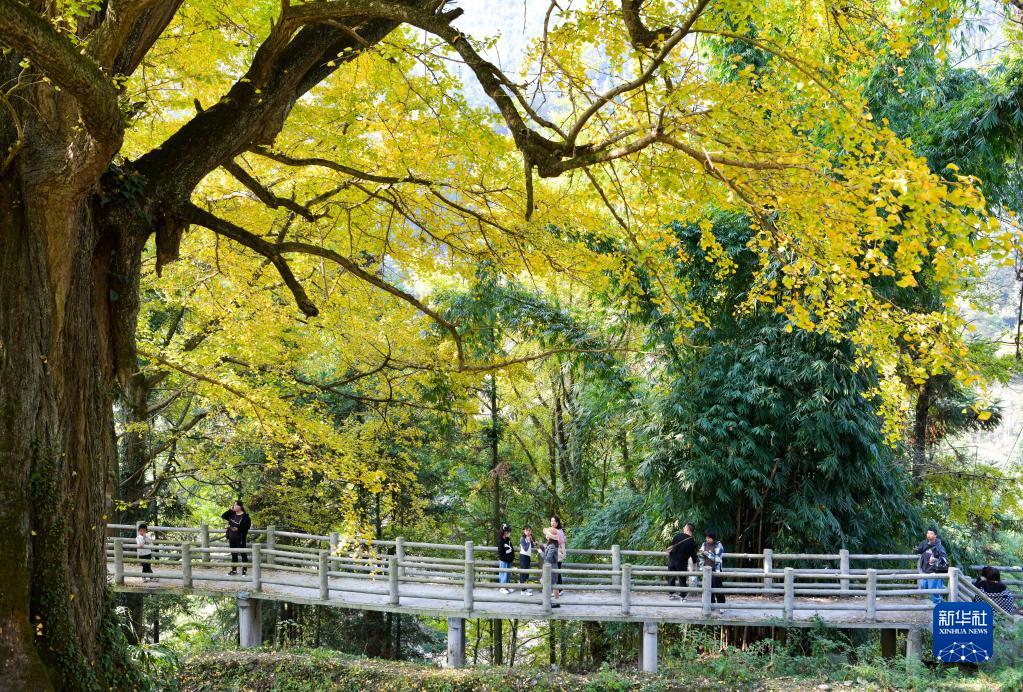11月6日,游客在貴州省貴陽市烏當區羊昌鎮黃連村的古銀杏樹下游覽。