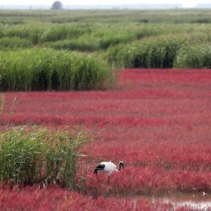遼河三角洲濕地包括蘆葦沼澤、淺海海域、河流庫塘、水稻田等濕地類型。濕地內分布各類野生動物。特殊環境孕育出的堿蓬草鋪滿灘涂,一到秋天這里就成了“紅色海岸線”。