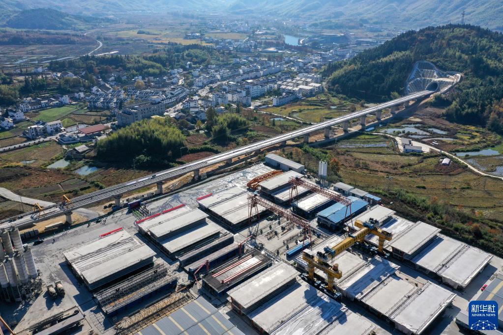 11月7日,中國鐵建大橋局池黃鐵路黃山制梁場施工人員在最后一榀箱梁澆筑現場施工(無人機照片)。