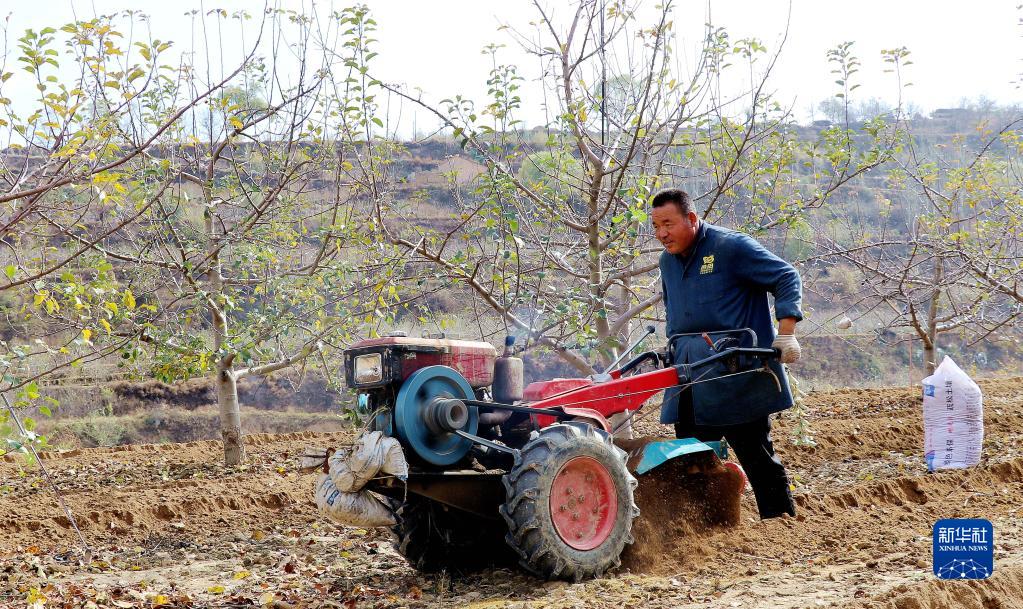 11月7日,在甘肅省平涼市靜寧縣威戎鎮楊灣村,果農在果園里駕駛農機開溝施肥。