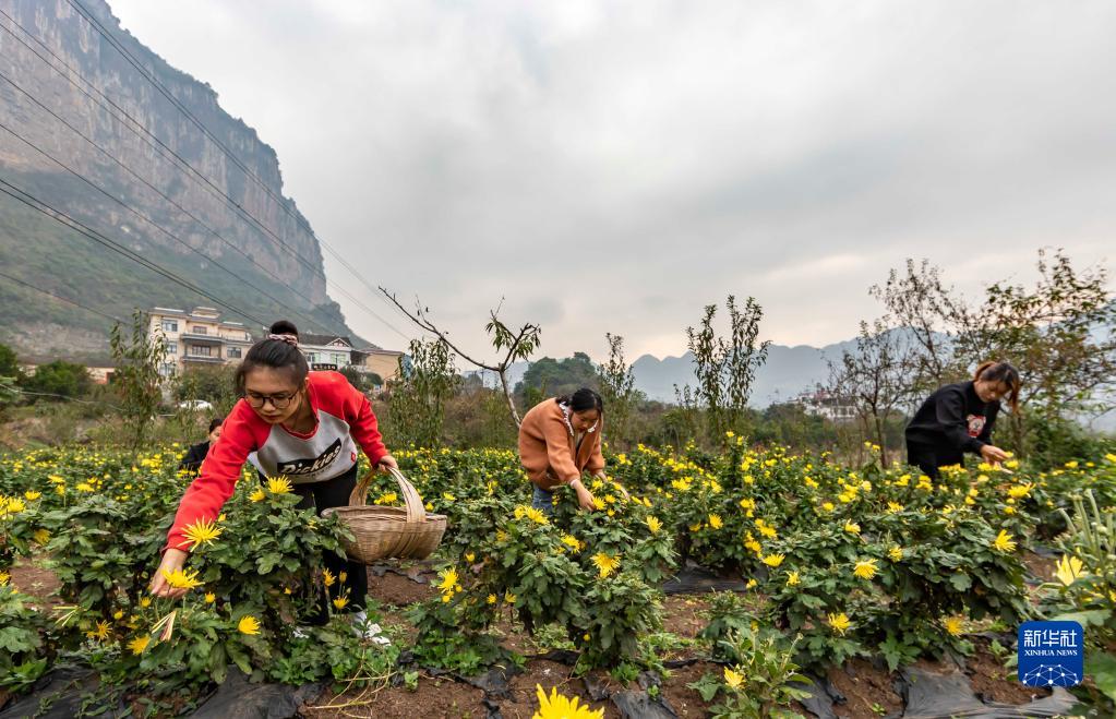 11月7日,村民在貴州省黔西市大關鎮丘林村采摘金絲皇菊。