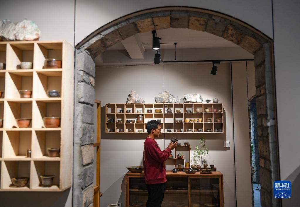 10月25日,在重慶市榮昌區通安村,“90后”手藝人管永雙在陶藝作坊查看作品。