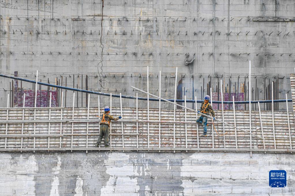 11月7日,施工人員在天角潭水利樞紐工程主壩工作。