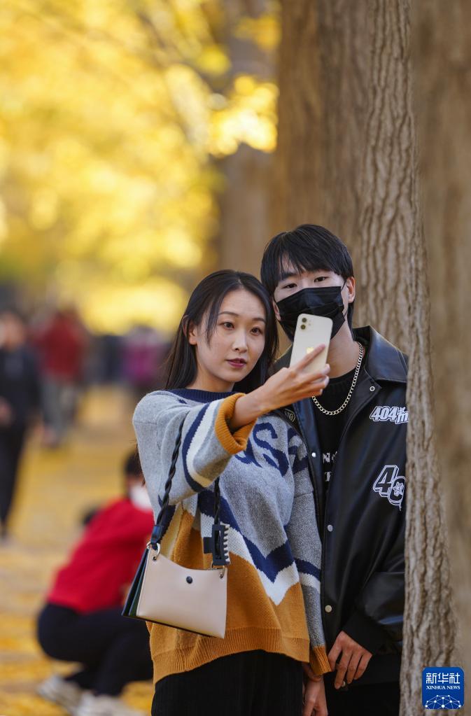 11月7日,兩位游客在北京釣魚臺國賓館旁的銀杏大道上自拍。