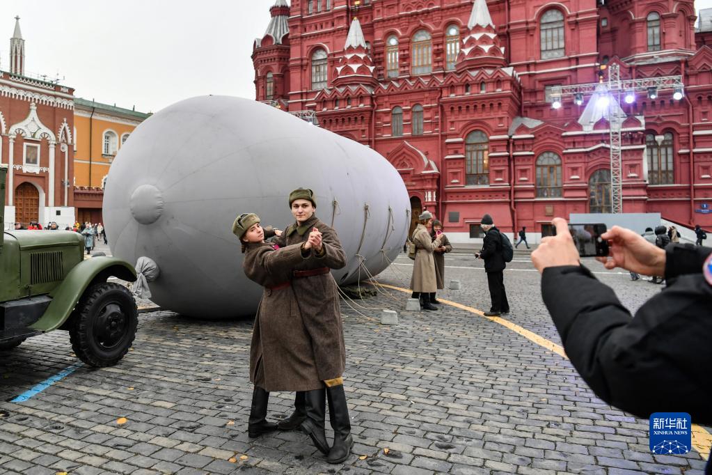 11月7日,在俄羅斯首都莫斯科,人們在以紀念1941年蘇聯紅場閱兵式為主題的露天展覽上拍照。