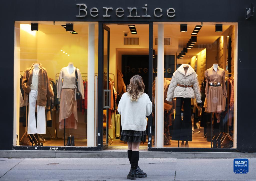 11月7日,一名女子望著法國巴黎一家服裝店櫥窗里的新品服裝。
