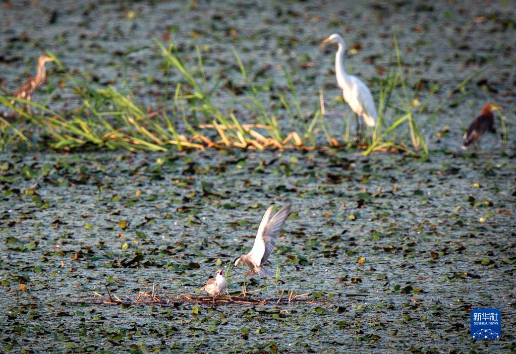 棲息在沉湖濕地的灰翅浮鷗給幼鳥喂食(8月3日攝)。