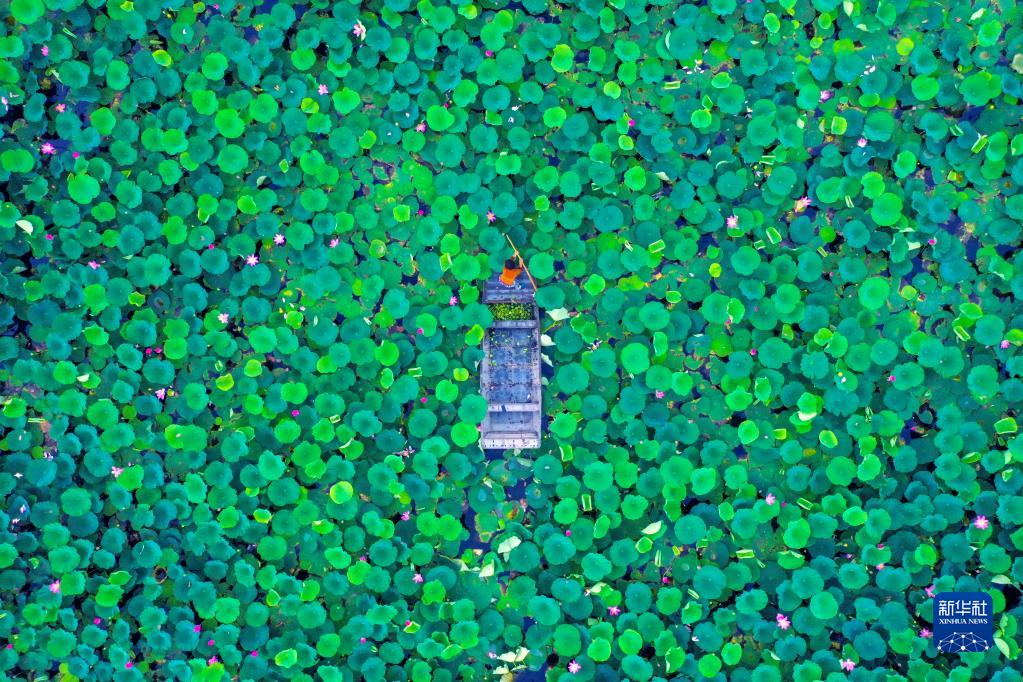 漁民在山東省濟寧市微山湖濕地采荷(無人機照片,2021年7月11日攝)。