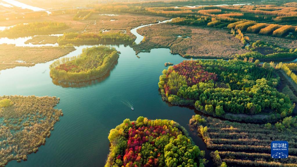 這是山東省濟寧市惠河濕地景色(無人機照片,11月7日攝)。