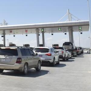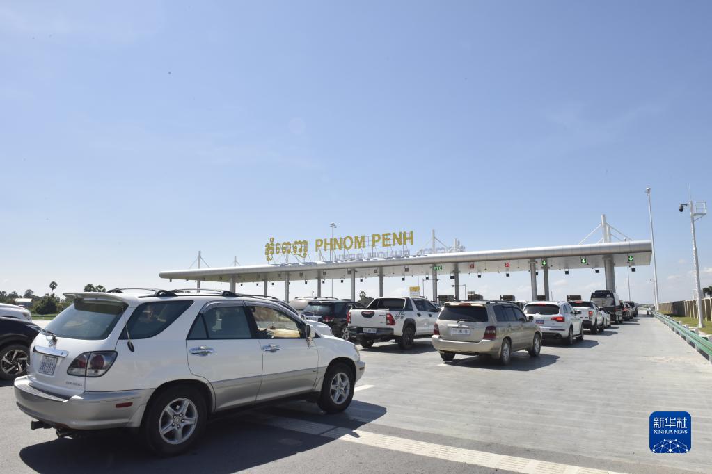11月7日,車輛在柬埔寨首都金邊的金港高速公路入口處排隊。
