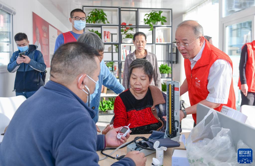 11月8日,在“時代楷?!卞X海軍勞模服務站,錢海軍(右一)與其他志愿者們一起為社區的老人們安排健康體檢。