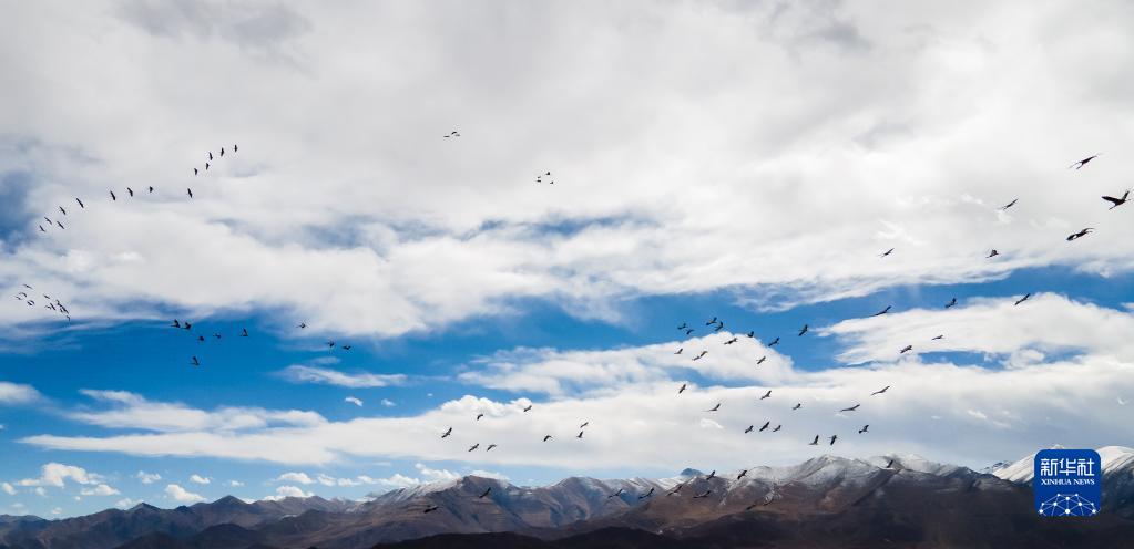 黑頸鶴群在林周縣強嘎鄉上空盤旋(11月6日攝,無人機照片)。