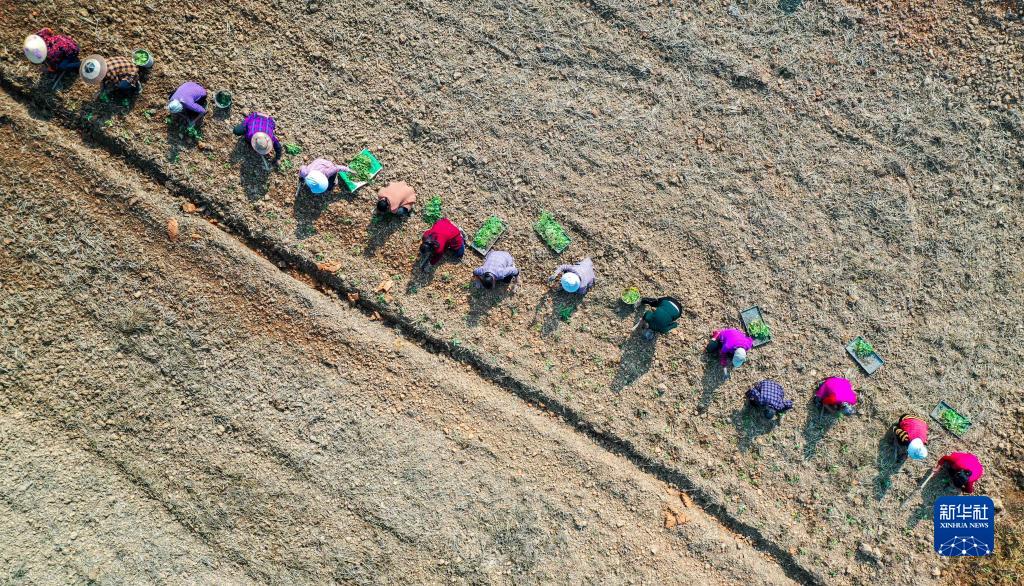 11月8日,在貴州省銅仁市玉屏侗族自治縣新店鎮沙水坪村,村民在高標準農田里種植油菜(無人機照片)。