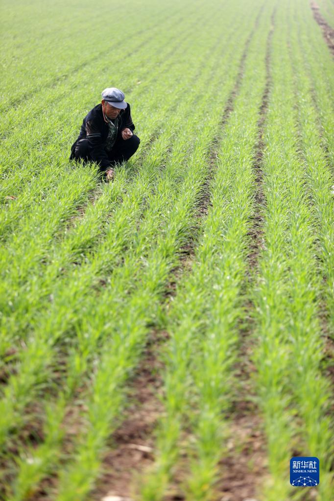 11月8日,山東省臨沂市郯城縣郯城街道農民在查看麥苗長勢。