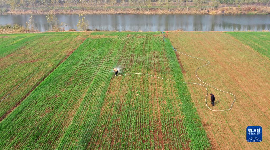 11月8日,山東省臨沂市郯城縣郯城街道農民在麥田間澆水(無人機照片)。